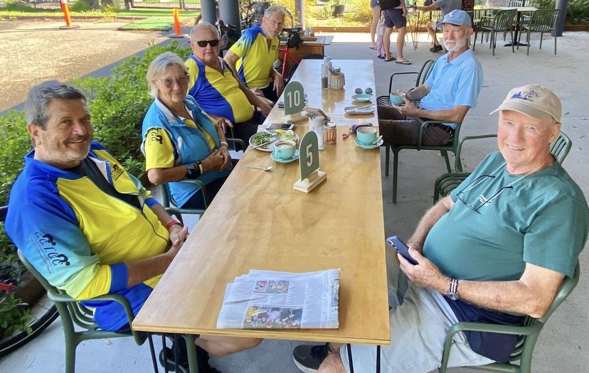![]() Coffee at the Heatherbrae Pie Shoppe - 26 October 2025 Palmdale Circuit - Six riders started out from Gosford at 8.00am riding to West Gosford and past the racecourse and down Showground Rd. Weather conditions were excellent with little wind and good cloud coverage. At Narara Station we met up with Greg who was having some issues with his seat, before we stopped at the Service Station at Ourimbah and added Nicolette to our riders. Under the railway line and north on Enterprise Drive took us to Chittaway. After crossing the railway, we headed down to old highway to the Heatherbrae Pie shop for coffee and something to eat. There were a couple of white utes whose drivers don't like bike riders and got too close to some riders and tried to intimidate by blowing the horns. At Heatherbrae we met up with Danny who had a table for us to share. Following the stop, we retraced our route back to Gosford whilst Nicolette headed back to The Entrance from the pie shop. Thanks to Duncan for sweeping. Andrew Thanks to Nikki for photo below. ![]() Colin, Andrew and support team at the pie shop - 26 October 2025 |